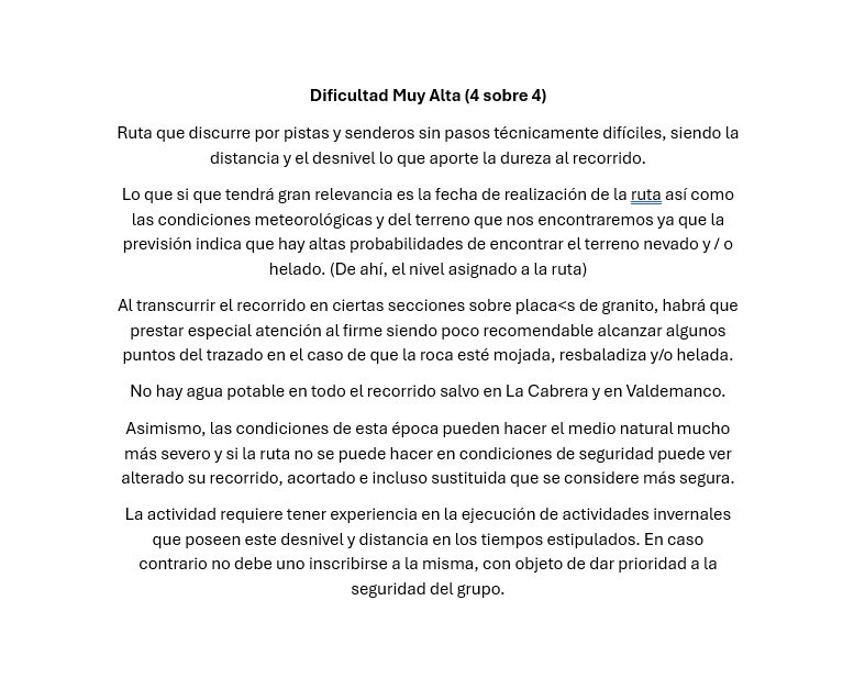 *Nota Importante: Aunque la actividad en condiciones de verano es bastante más sencilla se cataloga con mayor dificultad debido a que las condiciones invernales previstas incrementaran dicha dificultad. Si las condiciones no son las adecuadas para efectuar la actividad sin material de progresion, la misma podrá ser modificada, acortada o sustituida por otra propuesta más segura.
