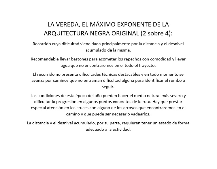 Las rutas propuestas son sencillas de llevar a cabo, carentes de dificultades técnicas reseñables y pensadas para el disfrute de los elementos enunciados. Disfrutaremos de bonitos bosques y arroyos, de algunas de las hoces y azudes que el Parque Natural posee en su interior, visitaremos La Vereda, una de las joyas de la arquitectura negra y Roblelacasa que es otro pueblo en el que la arquitectura negra es radicalmente diferente al de otros pueblos de la provincia.
